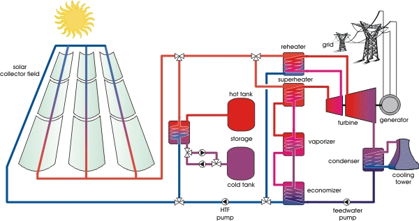 太陽能光熱發(fā)電(Concentrated Solar Power,簡“CSP”)是一種太陽能聚光熱發(fā)電技術(shù),依靠各種聚光鏡面將太陽的直接輻射(DNI)聚集,通過加熱導(dǎo)熱介質(zhì),再經(jīng)過熱交換產(chǎn)生高溫蒸氣,推動(dòng)汽輪機(jī)發(fā)電。